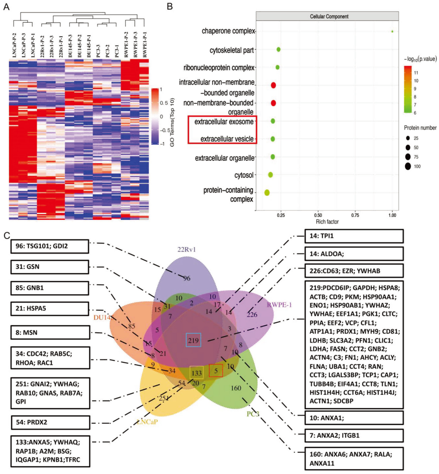 利用非标记定量蛋白质组学技术,对PCa细胞系(PC3、DU145、LNCaP和22Rv1)和正常前列腺上皮细胞系(RWPE-1)的sEVs,进行了深入研究,共鉴定到1570种蛋白,其中878种蛋白被定量,表现出在不同前列腺癌细胞系和正常前列腺上皮细胞中的表达差异。GO富集分析显示,所有sEV样本中,“细胞外外泌体”和“细胞外囊泡”成分丰富,这强调了sEVs及其在PCa中的重要作用。在所有五种细胞系sEVs中,发现了219种共有蛋白,133种sEV蛋白质仅在PCa细胞系中表达,5种sEV蛋白质仅在转移性PCa细胞系中表达。在超过50%的PCa样本中筛选出20种潜在sEV蛋白(在转移性PCa细胞系sEVs中高表达,而在局部原发性PCa细胞系或正常前列腺上皮细胞系sEVs中表达缺失或极低)进行进一步验证。
